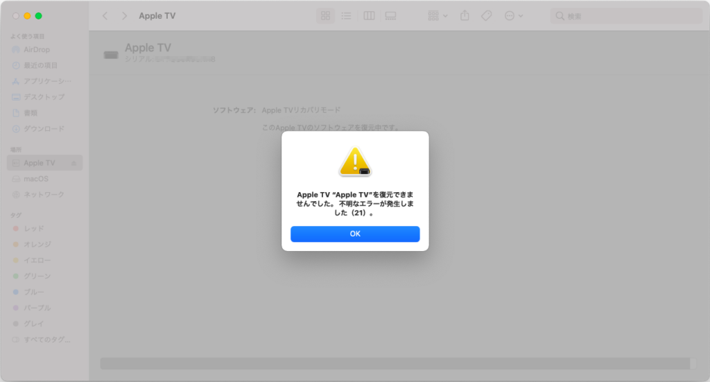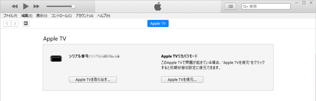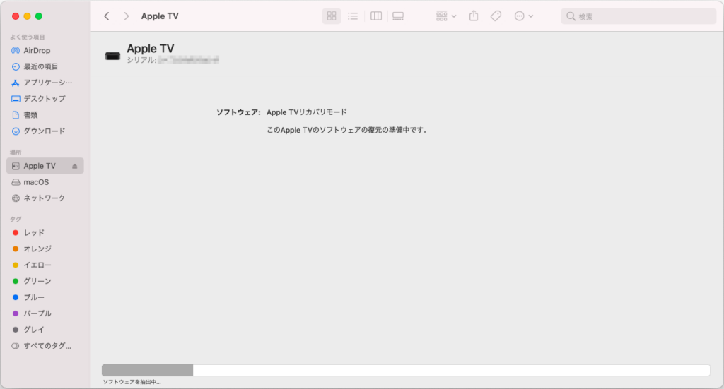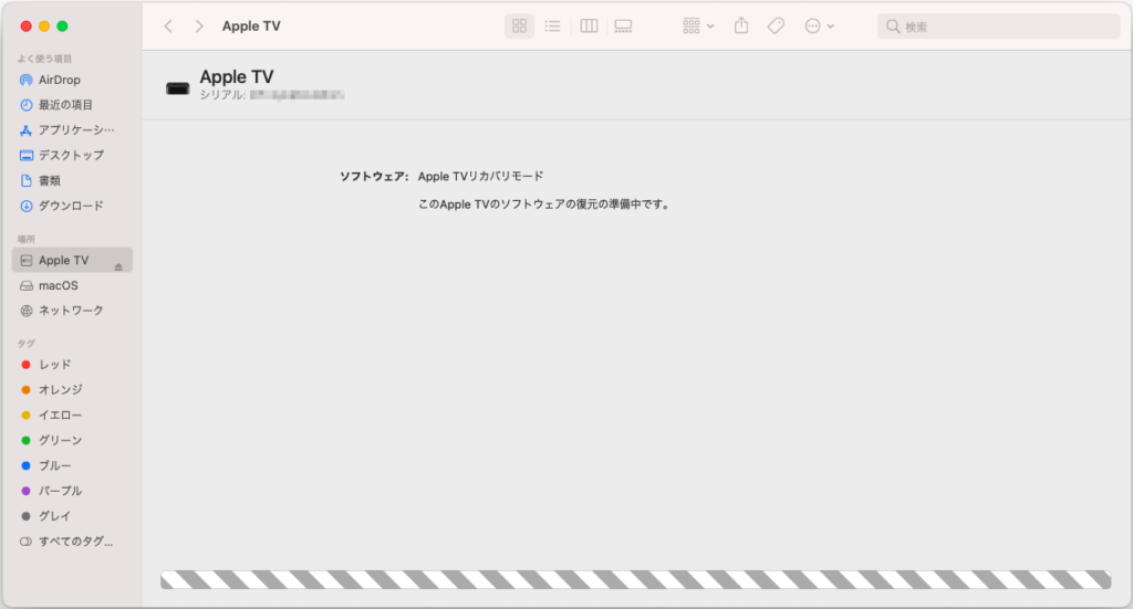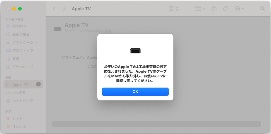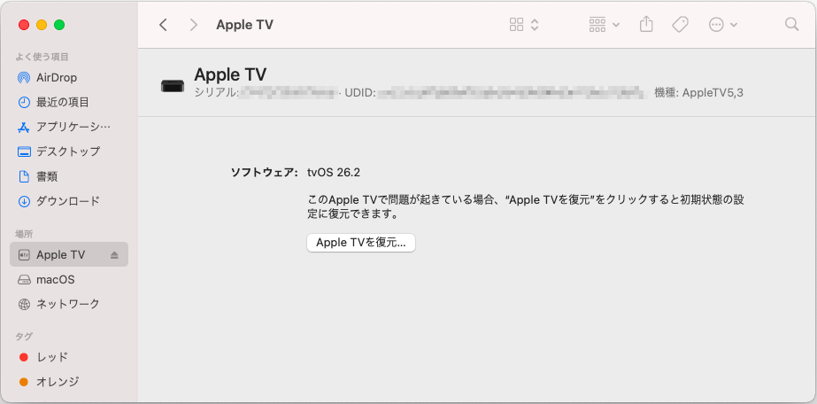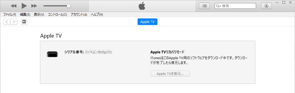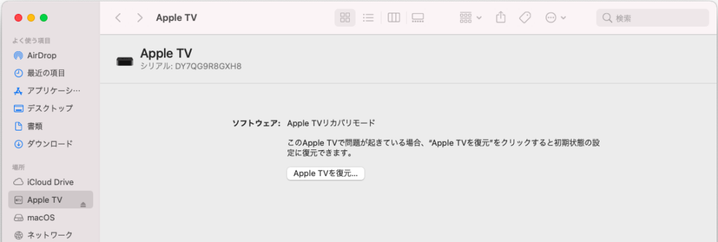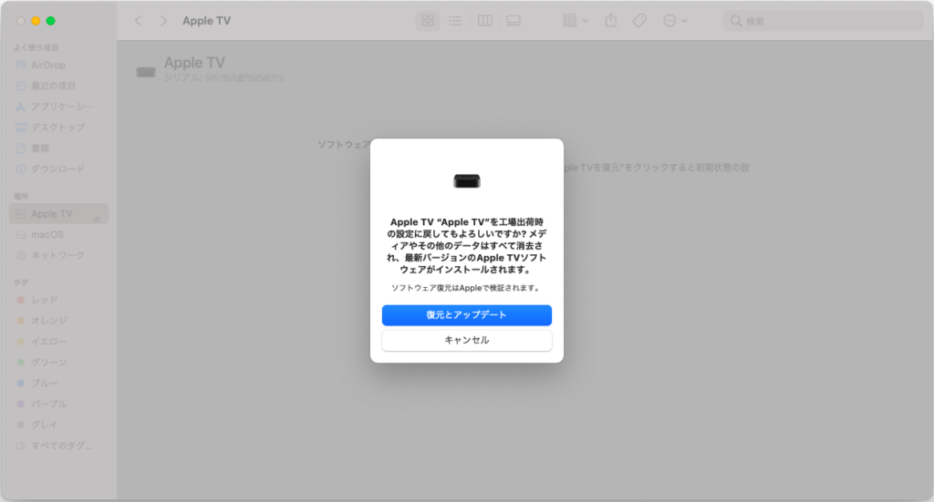 お、ちゃっかりApple TVを認識してくれる。もう勝ち確を確信した。画面の指示通りに復元をば。